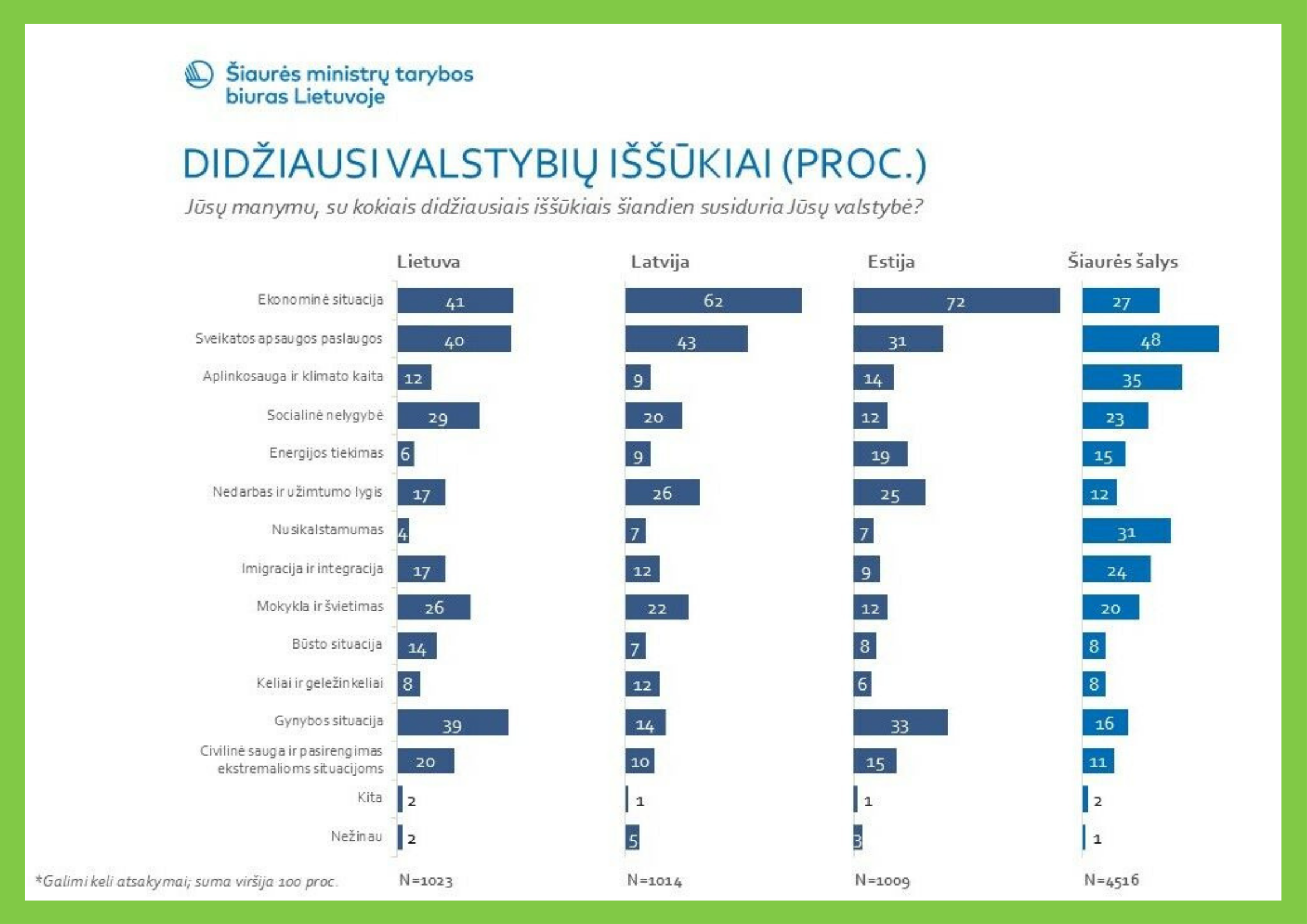 Nors Baltijos šalių gyventojai kaip ir kaimynai Šiaurės šalyse panašiai vertina klimato kaitos ir taršos grėsmes, tačiau šią sritį tarp svarbiausių šalies problemų nurodo tik 12 proc. Lietuvos, 9 proc. Latvijos ir 14 proc. Estijos respondentų. Šiaurės šalyse šis skaičius kur kas didesnis – aplinkosaugą ir klimato kaitą tarp didžiausių savo šalies iššūkių įvardina net 35 proc. respondentų. Gyventojų nuomone, tai antras pagal svarbumą iššūkis, su kuriuos susiduria jų šalys.