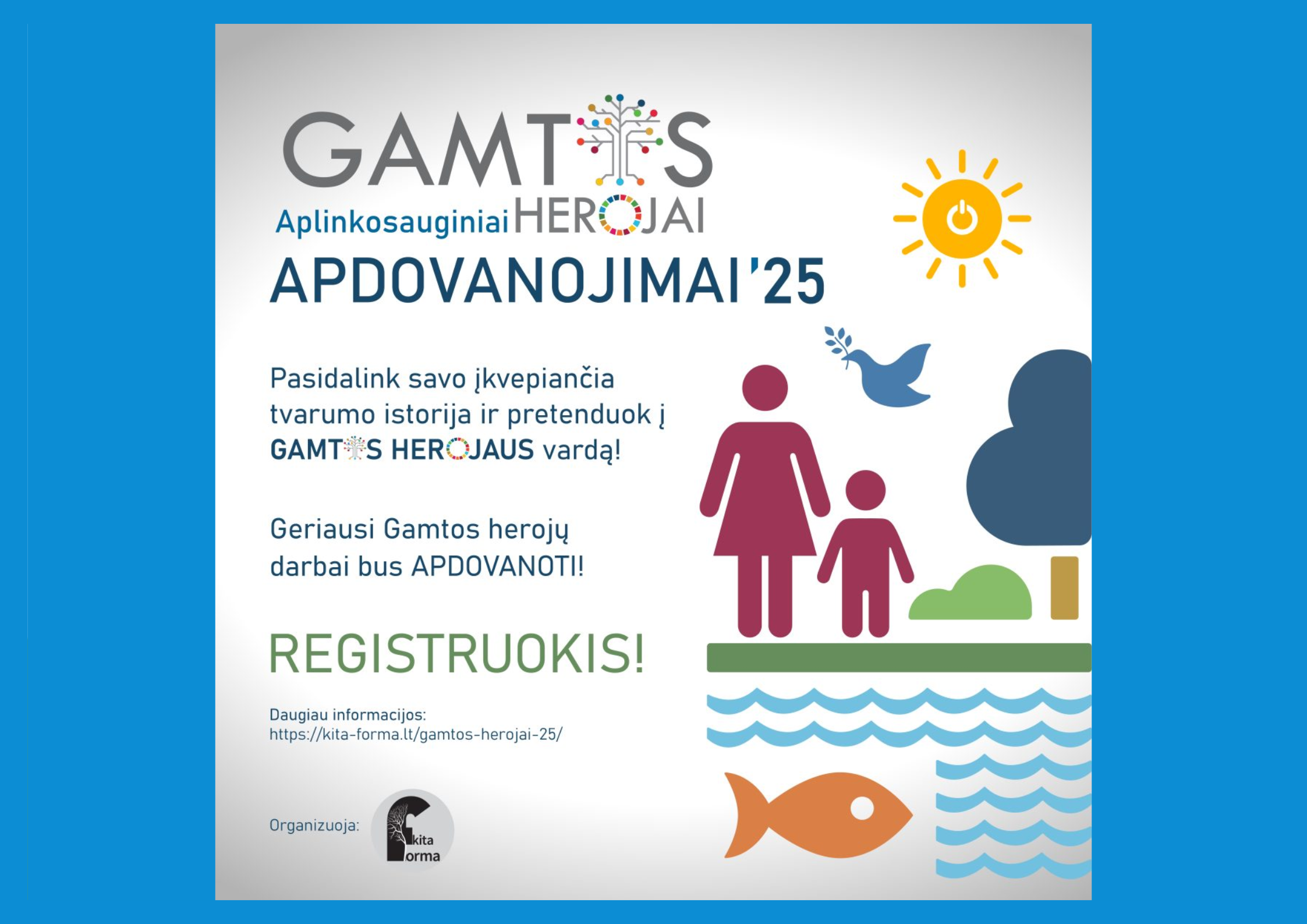 Tegu prasmingi darbai būna pastebėti ir įvertinti! Jau penktą kartą aplinkosauginės iniciatyvos „Kita forma“ bei VšĮ „Žaliasis taškas“ organizuojamo konkurso „Gamtos herojai“ tikslas – įvertinti, paviešinti ir apdovanoti gamtosaugos srityje aktyviai veikiančias, tvarumą skatinančias nevyriausybines organizacijas, aplinkosaugines iniciatyvas, mokytojus ir moksleivius / studentus už nuveiktus darbus saugant gamtą, prisidedant prie aplinkosauginio sąmoningumo ugdymo ir gamtai draugiško gyvenimo būdo formavimo bei aktyvios aplinkosauginių idėjų sklaidos savo aplinkoje, tokiu būdu rodant pozityvų ir siektiną pavyzdį visuomenei bei kitoms ugdymo įstaigoms!